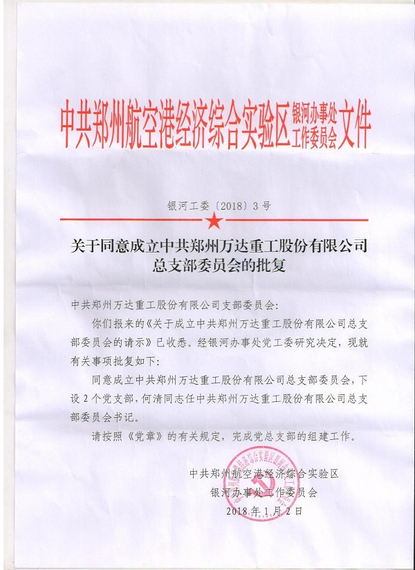 2018年1月10日上午10點(diǎn)整,中共鄭州萬達(dá)重工股份有限公司總支部委員會(huì)成立大會(huì)在鄭州萬達(dá)重工股份有限公司行政樓前隆重召開,鄭州航空港經(jīng)濟(jì)綜合實(shí)驗(yàn)區(qū)黨工委組織部程浩部長,銀河辦事處黨工委吳順祥書記、萬達(dá)重工董事長、書記何清、公司高管、全體黨員和員工代表參加了此次揭牌成立儀式。