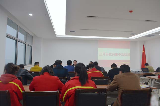 2017/03/31 541 3月29日晚上17點45分19點,萬達重工黨支部公司黨支部各黨員、預備黨員、入黨積極分子等28人在公司六樓會議室舉行了3月份黨員集中學習活動。 本次活動由黨支部副書記于江山主持,共分為5個議程。首先由副書記于江山同志介紹了新加入萬達重工黨支部的新力量,幾位新黨員分別做了自我介紹。其次由紀律委員薛如勛宣讀銀河辦事處201...