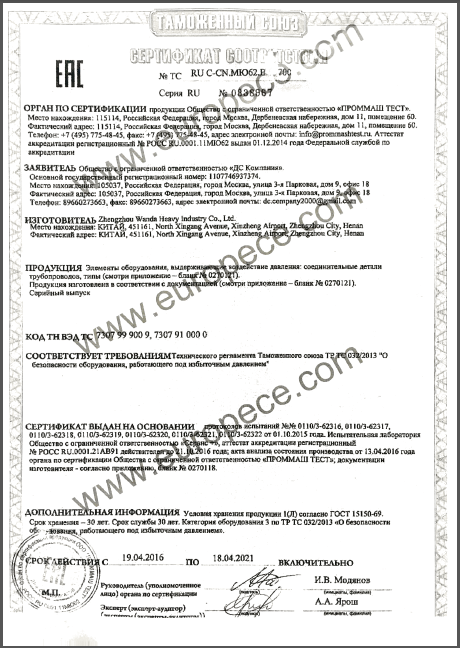 2016年4月20日,鄭州萬達重工股份有限公司順利通過海關(guān)聯(lián)盟“CU-TR”認(rèn)證,并獲得由“SERCONS”機構(gòu)頒發(fā)的證書。