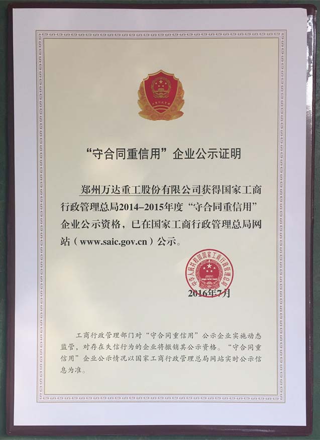 2016年10月14日上午,鄭州市“守合同重信用”公示活動表彰大會暨第三季度全市工商行政管理工作會議在鄭州市工商行政管理局召開。市工商局領導,各縣(市、區)工商質監局、各直屬分局主要負責同志及鄭州市“守合同重信用”企業代表200余人參加會議,會議上對全市28家2014-2015年度國家級“守合同重信用”企業和175家2014-2015年度省級“守合同重信用”企業進行了表彰,鄭州萬達重工股份有限公司均榜上有名,公司董事長何清作為國家級“守合同重信用”企業代表上臺領獎并作典型發言,鄭州市工商局吳鳳軍局長向獲獎企業表示熱烈祝賀并作了會議總結講話。