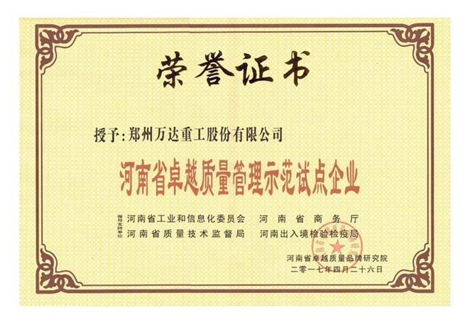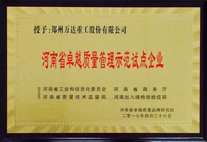 熱烈祝賀鄭州萬達重工股份有限公司榮獲由河南省工業(yè)和信息化委員會、河南省商務(wù)廳、河南省質(zhì)量技術(shù)監(jiān)督局及河南出入境檢驗檢疫局等單位共同指導,河南省卓越質(zhì)量品牌研究院組織評選認定的“河南省卓越質(zhì)量管理示范試點企業(yè)”榮譽稱號。