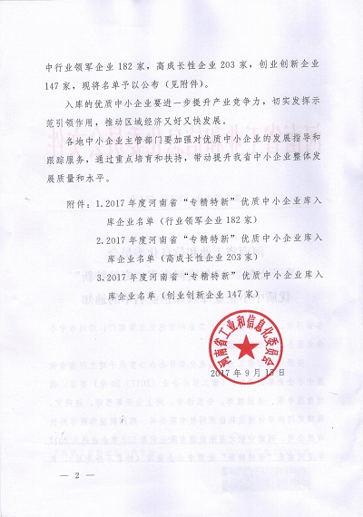 按照《河南省工業(yè)和信息化委員會辦公室關(guān)于建立河南省優(yōu)質(zhì)中小企業(yè)庫的通知》(豫工信辦企業(yè)【2017】20號)的要求,經(jīng)過自愿申報、逐級推薦、專家評審、網(wǎng)上公示等程序,鄭州萬達(dá)重工股份有限公司成果入選河南省“專精特新”優(yōu)質(zhì)中小企業(yè)庫,被認(rèn)定為行業(yè)領(lǐng)軍企業(yè)。