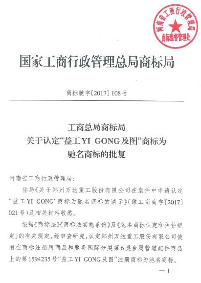 根據國家工商行政管理總局商標局下發的商標馳字【2017】108號《工商總局商標局關于認定“益工 YI GONG及圖”商標為馳名商標的批復》文件,公司使用在商標注冊用商品和服務國際分類第6類金屬管道配件商品上的“第1594235號益工YI GONG及圖”商品被認定為中國馳名商標”,這不僅是公司商標保護的重大成果,也實現了鄭州航空港經濟綜合實驗區馳名商標零的突破。