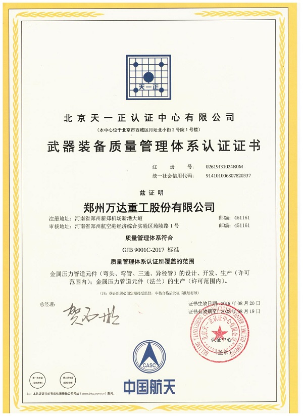 熱烈祝賀鄭州萬達重工股份有限公司獲得《武器裝備質量管理體系認證證書》
