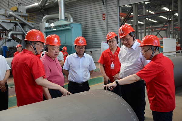 張會長一行先后深入堆焊智能制造車間、彎制車間、機加工、物流倉儲等生產車間進行了參觀,實地查看了公司先進的生產設備、繁忙而有序的生產環境,股份公司總經理張付峰分別就公司生產設備、技術及生產能力情況向調研組一行進行了詳細講解,調研組一行對萬達重工現代化的管理理念,一流的生產能力表示贊賞。