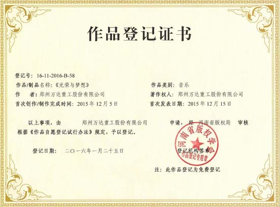 2016/03/04 409 熱烈祝賀鄭州萬達重工股份有限公司司歌《光榮與夢想》通過河南省版權局審核,并榮獲河南省版權局版權證書。