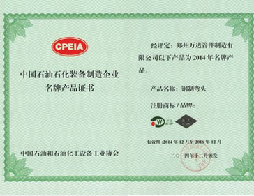 2016/01/28 417 公司益工牌鋼制彎頭被評為2014年中國石油石化裝備制造企業名牌產品。